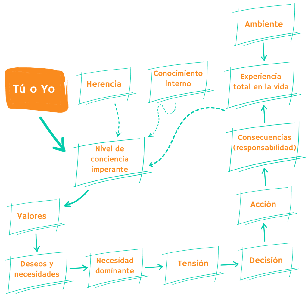 Así, el nivel de conciencia imperante determina los valores de la persona, los cuales a su vez generan sus deseos y necesidades y, dentro de éstos, siempre destacará en un momento determinado una necesidad dominante o motivante, que generará tensión y obligará a tomar decisiones y acciones que le acarrearán consecuencias, que a su vez alimentará su experiencia en la vida y continuará el ciclo.